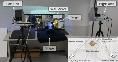 プロジェクタカメラユニットではプロジェクタ(Projector)とカメラ(Camera)の投影中心(投射線の交点)をプレートビームスプリッタ(Plate Beam Splitter : PBS)によって光学的に同じ位置に配置することで,物体の位置や形状に不変な投影映像のマッピングを実現しました. PBSで反射された光はユニット上部で減衰反射の後に吸収されます.それぞれのユニットは情報共有なく独立に制御されており,形状モデルやユニットの位置合わせを必要としない,適応的なプロジェクションマッピングを実現します.