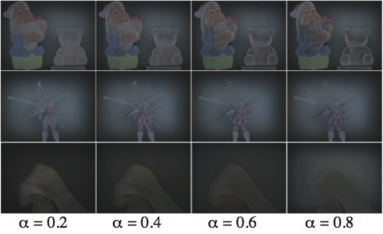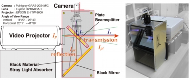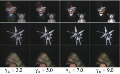 本研究では瞳位置が一致したプロジェクタカメラ系(上段)を試作し、光投影を行うことで現実物体の見かけの透明感(中段)や光沢感(下段)を実時間で変化させる技術を確立しました。現実世界で物体の質感を操作する技術はデザイン支援へ応用することができます。例えば、宝飾品から工業製品に至る様々な製品のデザイン過程では試作を行いますが、試作品の質感を変化させることが出来れば、素材の選定や装飾方法の検討の際に試作を繰り返す必要がなくなります。