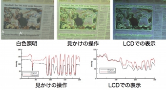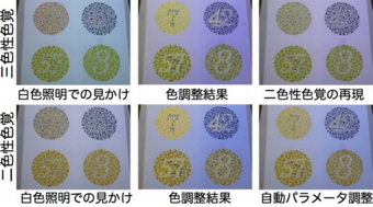 また,この技術は二色性色覚のためのカラーマネージメントにも応用可能です.二色性色覚では混同色が含まれる図や文字の視認が困難ですが,このような問題を光投影によって再現することでデザインの不具合を事前に確認したり,見かけの操作技術を実装した照明装置を用いることで二色型色覚による色の混同の問題が軽減できるます.