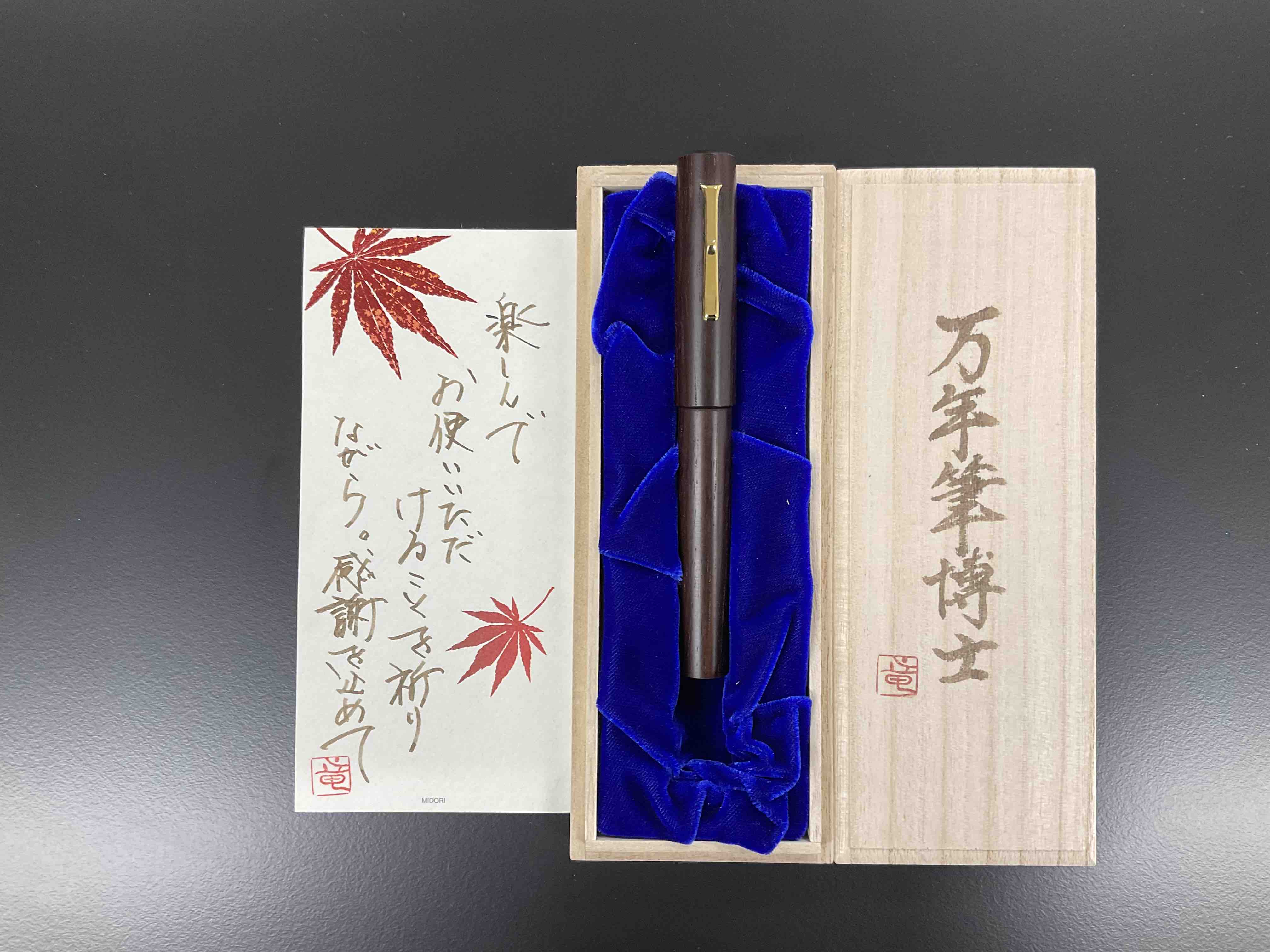 第6回茶話会は,9月中に開催して私のインクコレクション新入りを紹介しました.ただその時の印象を忘れたので10月30日開催の第7回について記載します.場所は第5回から借りている北304室です.今回は国際交流課から3名,学務課教務から2名及び私達5名プラスビッグゲストの学部長Y先生の計11名でした.主要トピックスは,学部長新規購入のツシマヤマネコ万年筆(石丸文行堂)のお披露目でした.キャップには猫の肉球及びニブには猫のイラストが刻印されています.イラストは細かい仕事だと思います.流石に私のものではないので写真は撮りませんでした.そしてトピックスの二番目はこの日に間に合った昨年発注の万年筆博士の万年筆です.これは私の所有物なので下に写真を載せます.これについては私のせこい性格を悔いています.なぜ黒壇軸にしなかったのか,当時の心境ゆえ致し方なかったとはいえ,ペン先を極太にしなかったのかなどです.今回は参加者の皆さんの声が互いにかき消されるほど盛況であったのでもう一回やれという声も頂いた次第です.次回のネタというか議題をどうしたらいいのかと悩むところです.