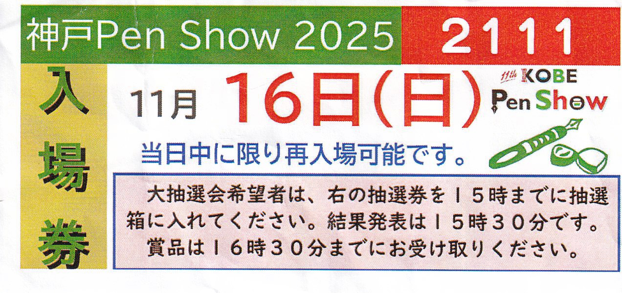 神戸三ノ宮または元町駅から徒歩圏内にある北野ノスタにて11月15日と16日2日間に渡って開催されました.北野ノスタは,旧北野小学校跡にできた複合施設で昨年から神戸ペンショーの開催場所となっています.私は16日に行きました.出店した店などの一覧は,こちらにあります.最後に入場者には抽選で各店舗の提供する景品があたります.私は残念ながら昨年同様当ててもらえませんでした.ワーグナー会員のなかで知り合いの人が二人当たったと喜んでおられました.