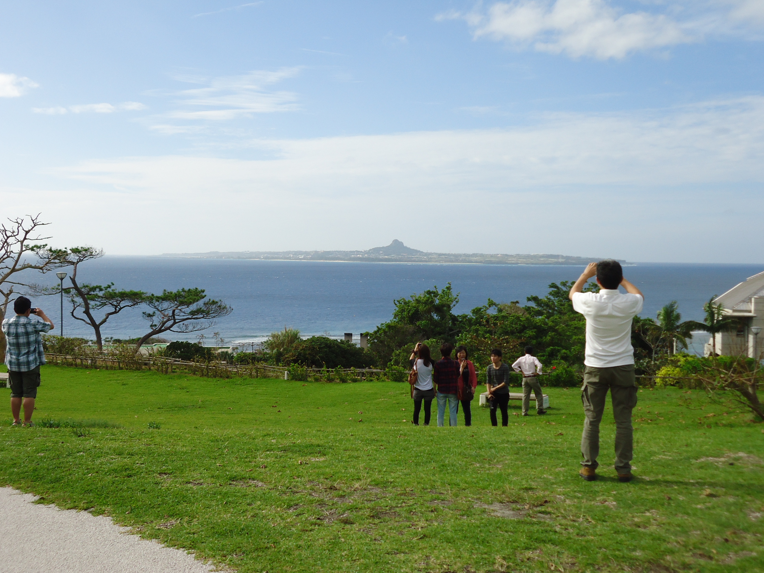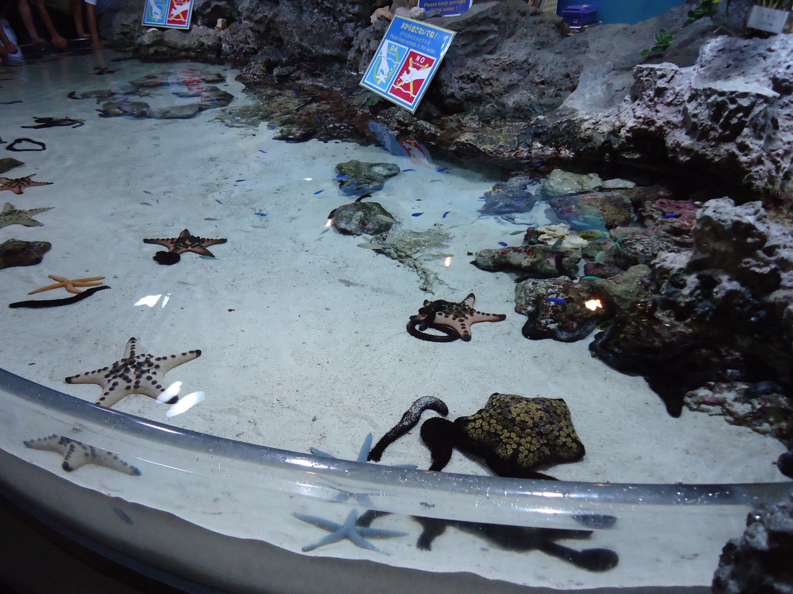| 美ら海水族館にて。背景は伊江島。 | ナマコとヒトデ。さわれます。魚にはさわれないそうです。 (さわっている写真がなかった・・・) |