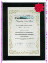徳島大学工学部で開催されたThe Second Japan-Korea Workshop on Digital Holography and Information Photonics (DHIP 2012)で井邊君がDynamic recording and reconstruction in single-exposure generalized phase-shifting digital holography,森君がSynthesis from low-coherence digital holograms for three-dimensional imaging,北澤君がRefractive index measurement of internal defects by digital holographic tomography using reconstruction calculation method with lightwave propagationのポスター発表(講演番号順),野村がCoaxial holographic memory using spatial light modulated lightwavesの招待講演をしました.井邊君は4度目,森君は3度目,北澤君はお初のポスター発表でした.野村はポスター発表の場にいることはできませんでしたが,無事にこなしたようです.Good Job! 井邊君は数あるポスター発表の中からOutstanding Poster Awardを受賞しました.お見事!おめでとう.
